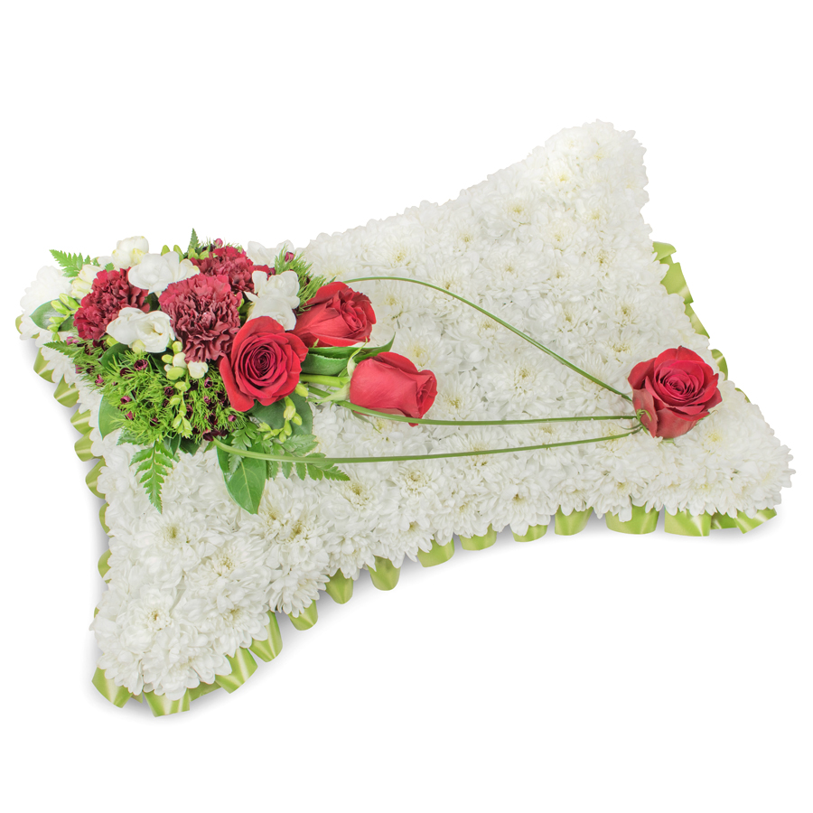 Send your deepest sympathies with our beautiful sympathy flower bouquet, expertly arranged with fresh and quality blooms. This lovely bouquet features white chrysanthemums, vivid red roses, fragrant white freesias, and dark red carnations, enhanced by delicate dianthus and soft bear grass for an elegant presentation.